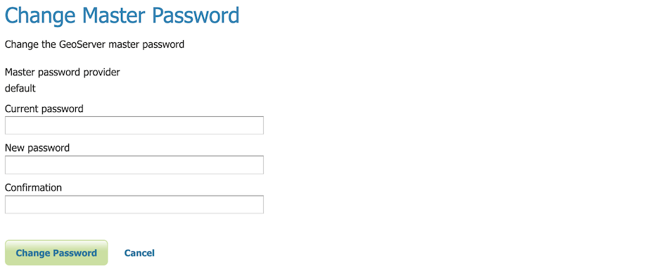 Current password geoserverNew password (make up a new password) Confirmation: (confirm new password) If you do not know the current password, navigate to Security > Passwords and there is an option to recover the password (either to a local file or via REST API).
