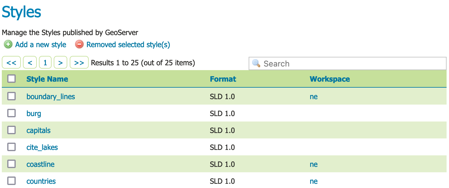 This page displays a list of styles, including the workspace the style belongs to.