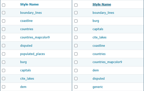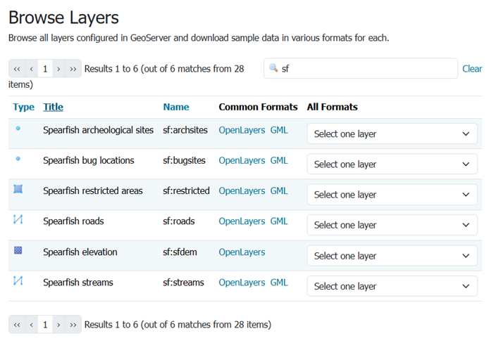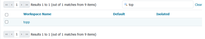 4. Searching can be used to filter the number of items displayed. This is useful for working with data types that contain a large number of items. To search data type items, enter the search string in the search box and click Enter. GeoServer will search the data type for items that match your query, and display a list view showing the search results.