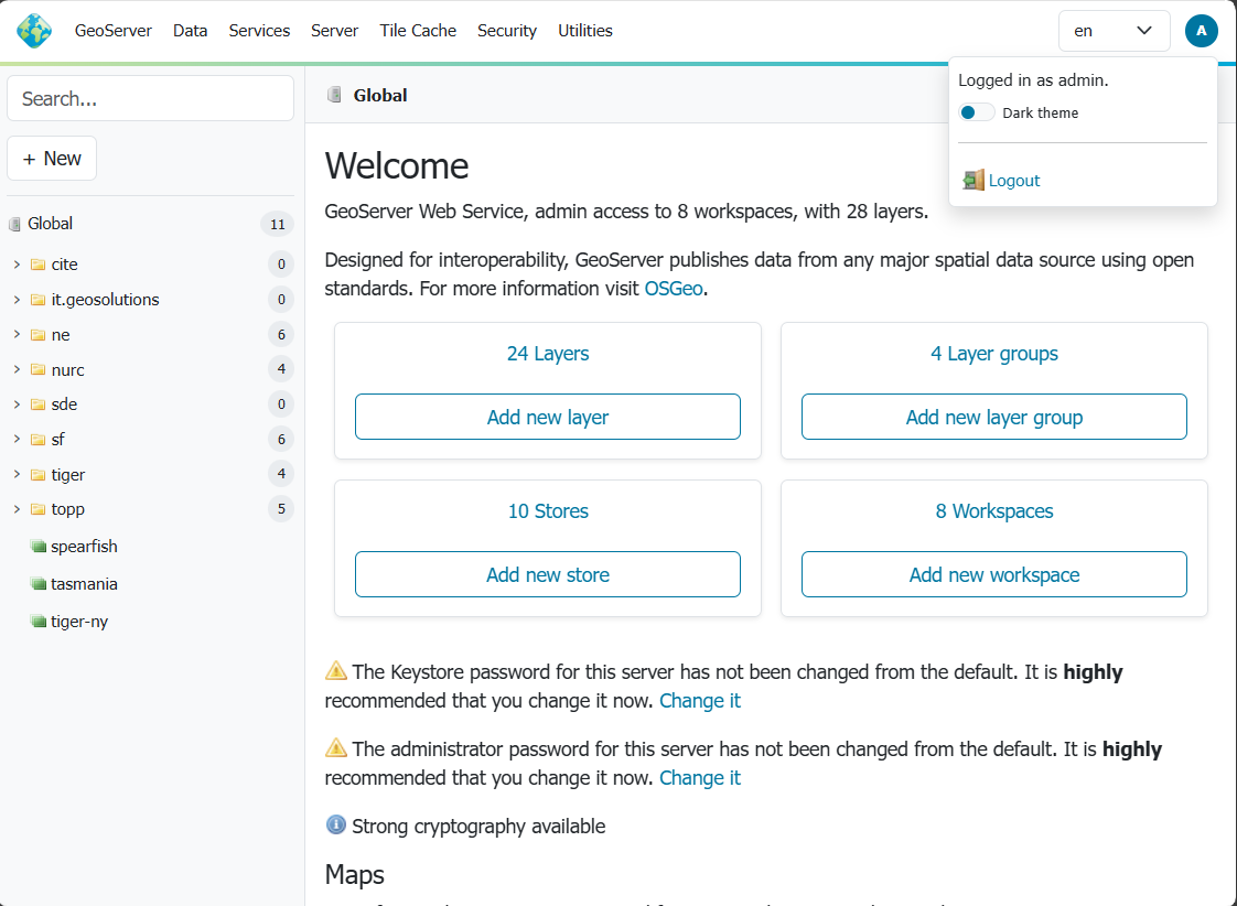 GeoServer has a browser-based web administration interface application used to configure all aspects of GeoServer, from adding and publishing data to changing service settings.