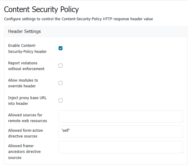 Use the Inject proxy base URL into header checkbox to inject the proxy base URL into the form-action directive and all fetch directives that normally allow 'self'. This is only necessary for certain use cases where web browsers are able to access a GeoServer host directly rather than through the proxy and the HTML response contains absolute URLs to the proxy base URL. This does not guarantee that other browser restrictions will not prevent the page from functioning.