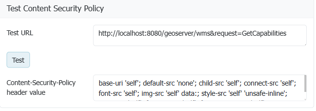 GeoServer gives administrators complete control over the CSP header directives and sources and does not attempt to parse or validate them so it is the administrator's responsibility to verify that the header is working as intended when modifying this field. See System Administrator CSP Settings for detailed information about valid Content Security Policy header directives and sources.