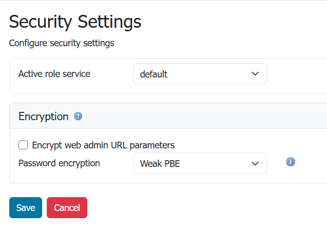 This setting allows you to select the type of Password encryption used for passwords. The options are Plain text, Weak PBE, or Strong PBE.