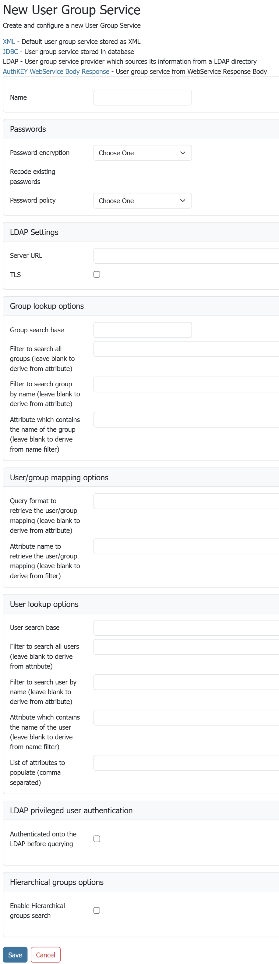 To add a new LDAP user/group service, click the Add new link, and then the LDAP option at the top of the following form. The following figure shows the configuration options for a LDAP user/group service.