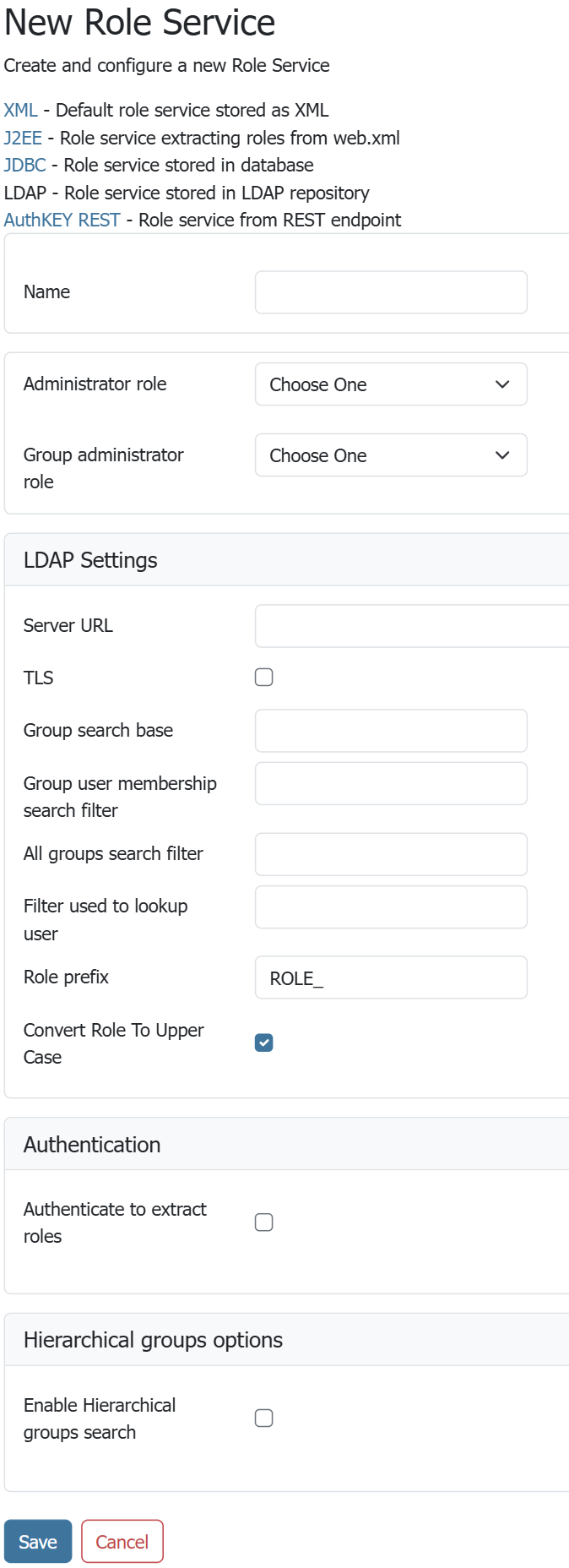 To add a new LDAP role service, click the Add new link, and then the LDAP option at the top of the following form. The following figure shows the configuration options for a LDAP role service.