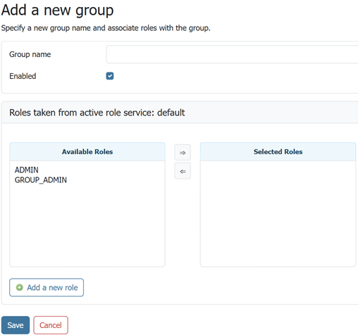 | Role list | Full list of roles, including a list of roles to which the group is associated. Association can be toggled here via the arrow buttons. |