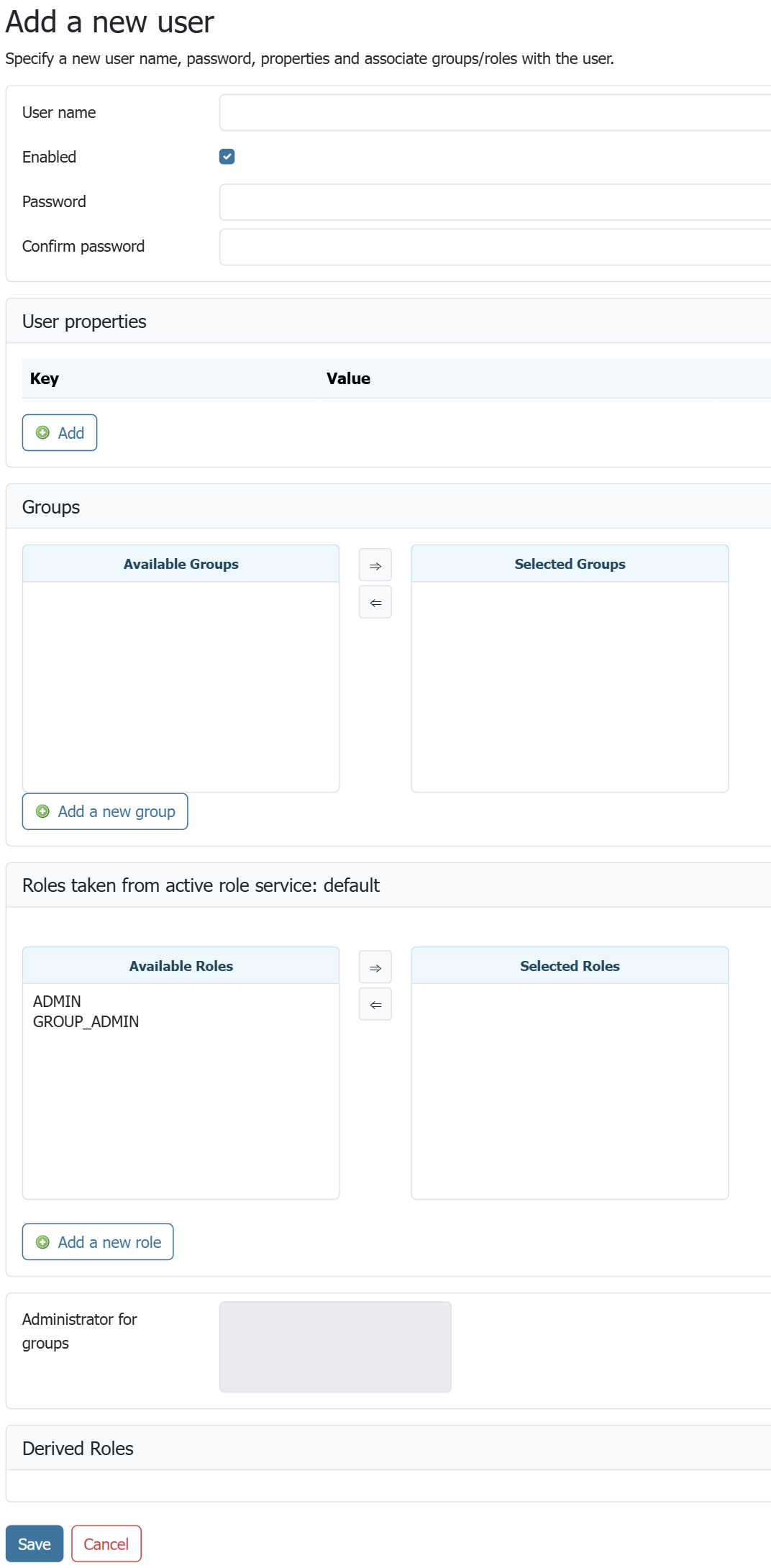 This section provides the configuration options for User/group services and Role services. In addition, users, groups, and roles themselves and can be added, edited, or removed. A great deal of configuration can be accomplished in this section and related pages.