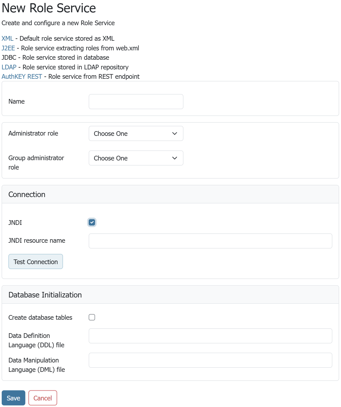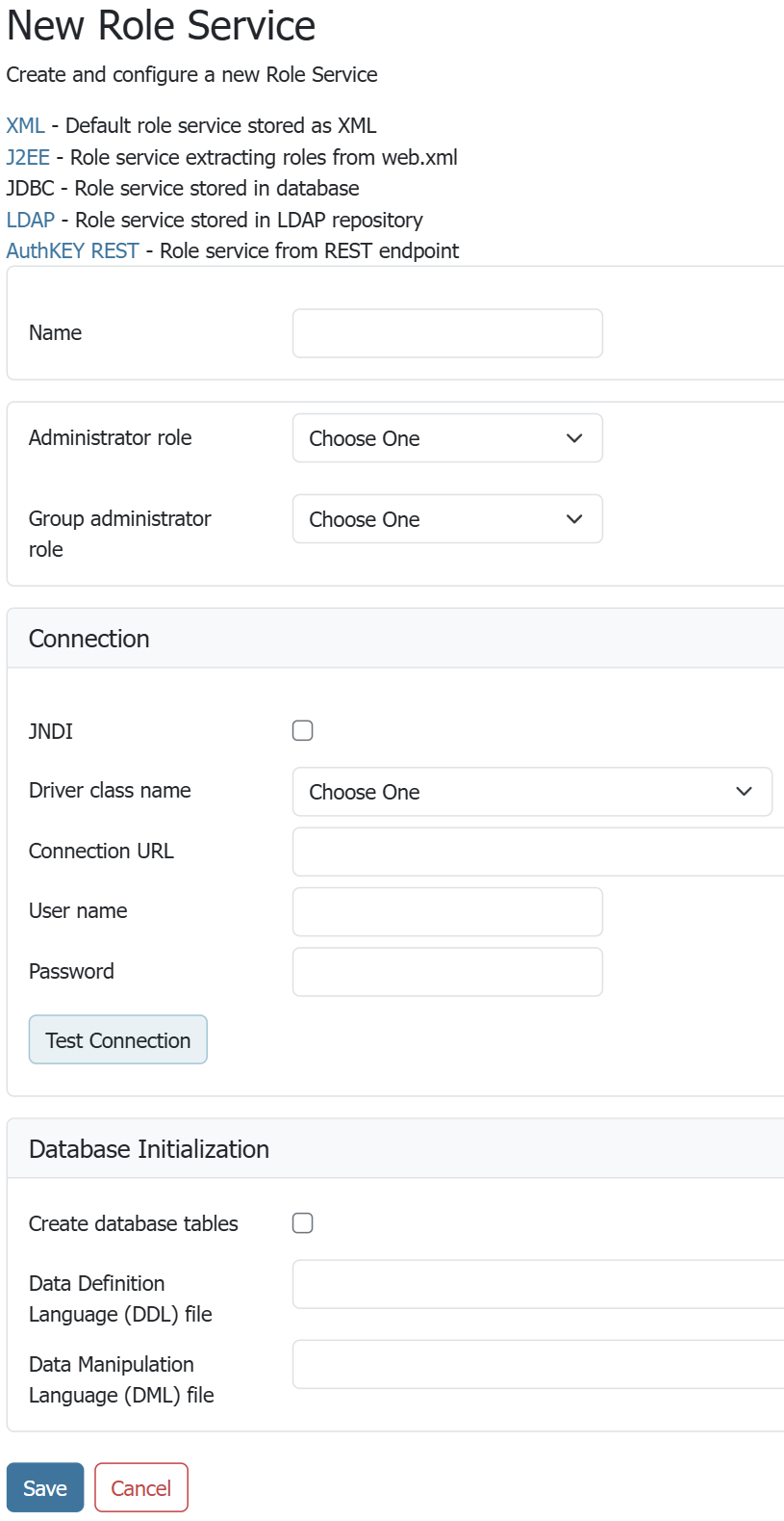 To add a new XML role service, click the Add new link, and then the JDBC option at the top of the following form. The following figure shows the configuration options for a JDBC role service.