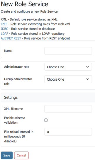 | XML filename | Name of the file that will contain the role information. Default is roles.xml in the security/role/<name_of_roleservice> directory. |