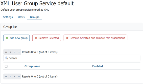 The Groups tab provides configuration options for groups in this user/group service. There are options to add and remove a group, with an additional option to remove a group and the roles associated with that group.