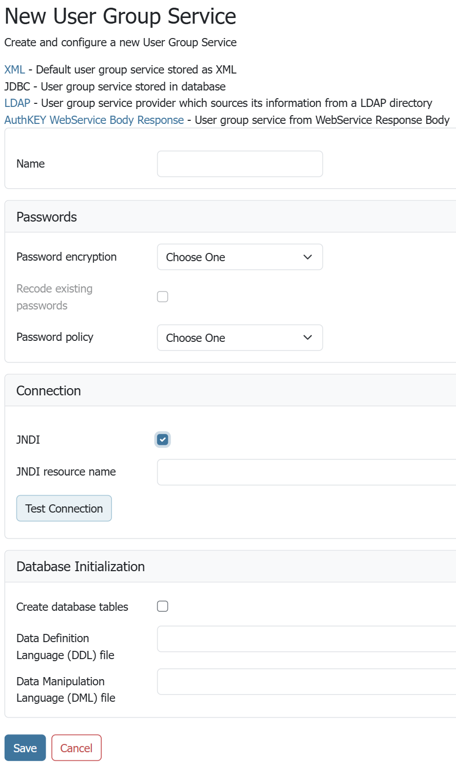 To add a new JDBC user/group service, click the Add new link, and then the JDBC option at the top of the following form. The following figure shows the configuration options for a JDBC user/group service.
