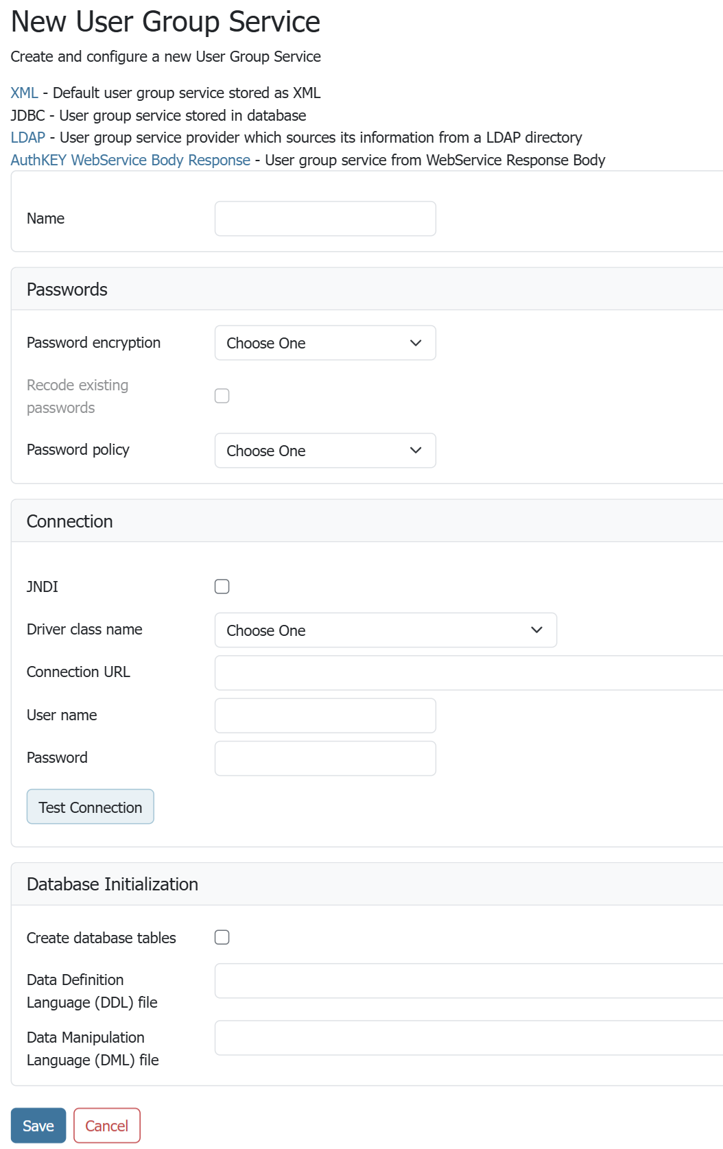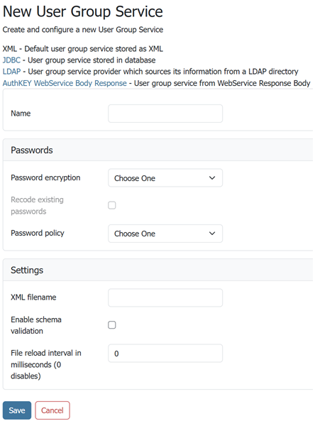 To add a new XML user/group service, click the Add new link. XML is the default option. The following figure shows the configuration options for an XML user/group service.