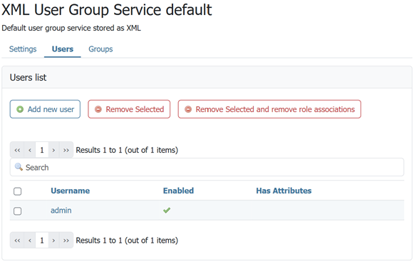 Once the new user/group service is added (either XML or JDBC), clicking on it in the list of user/group services will allow additional options to be specified, such as the users and groups associated with the service.