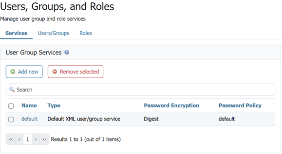 | XML filename | Name of the file that will contain the user and group information. Default is users.xml in the security/usergroup/<name_of_usergroupservice> directory. |
