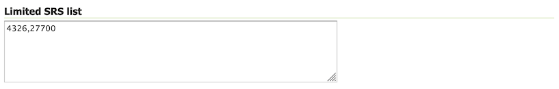To limit the service to only the required projections use the Limited SRS List text box to list the desired EPSG codes separated by commas, e.g. 4326,27700 .