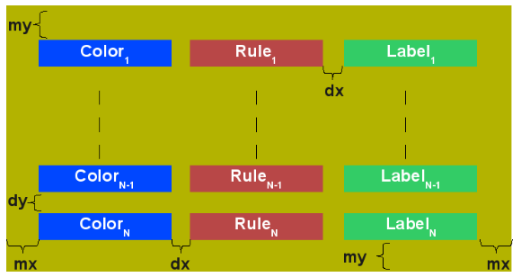 - dx,dy the spaces between elements and rows are set to the 15% of the requested width and height. Notice that dy is ignored for the colormaps of type ramp since they must create a continuous color strip.