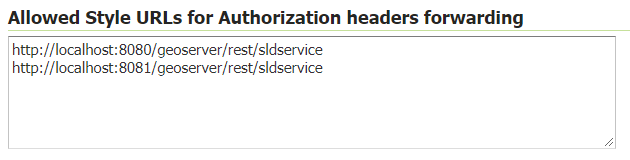 A GetMap request may specify the style by referring a remote URL in the SLD parameter. There might be the case that the remote URL require same authorization headers as the current GetMap request. If that's the case a list of allowed style URLs can be specified using newline as separators (URLs might be long). Authorization headers will be only forwarded to a remote URL when it starts with one of the specified URLs.