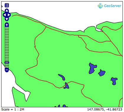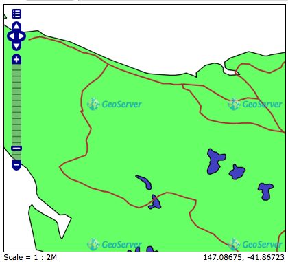 Because each WMS request renders the watermark, a single tiled map positions one watermark relative to the view window while a tiled map positions the watermark for each tile. The only layer specific aspect of watermarking occurs because a single tile map is one WMS request, whereas a tiled map contains many WMS requests. (The latter watermark display resembles Google Maps faint copyright notice in their Satellite imagery.) The following three examples demonstrate watermark position, transparency and tiling display, respectively.