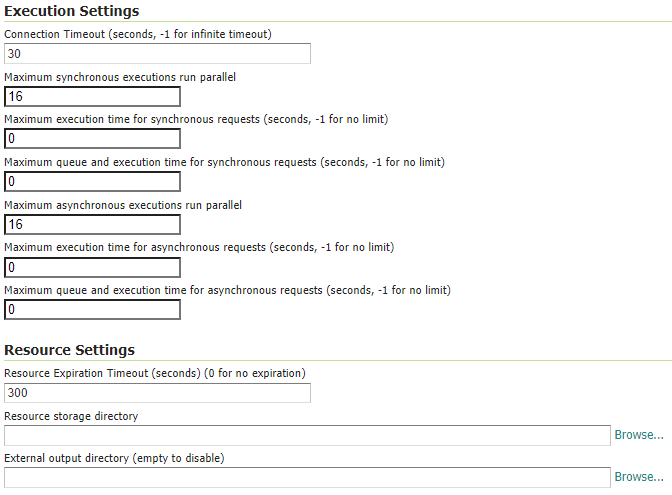 - Resource expiration timeout: number of seconds the result of a asynchronous execution will be kept available on disk for user to retrieve. Once this time is expired these resources will be eligible for clearing (which happens at regular intervals).