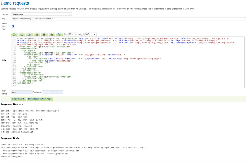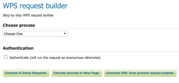 The GeoServer WPS extension includes a request builder for testing out WPS processes through the Web administration interface. This tool can also be used to demonstrate processes, and construct your own examples.